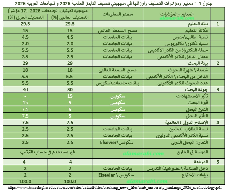 أصبحت المنهجية الأساسية لتصنيف التايمز للجامعات العربية 2026 أكثر توافقًا مع تصنيف الجامعات العالمية كما يبين جدول 1 وشكل 1.