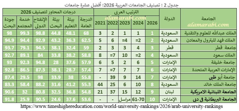 يعرض جدول 2 أداء أفضل 10 جامعات عربية في مؤشرات التصنيف (المبينة في جدول 1)، وفق تصنيف التايمز للجامعات العربية 2026 ؛ ويشمل الدرجة العامة، ودرجات هذه الجامعات في محاور التصنيف الخمسة.
