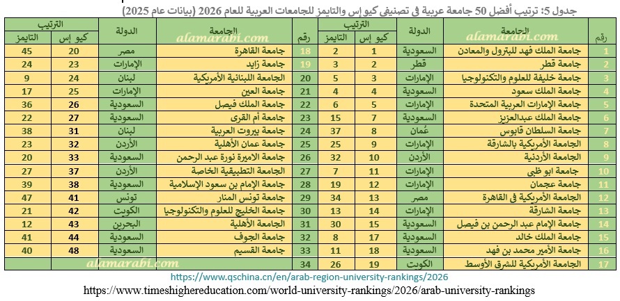 تصنيف التايمز للجامعات العربية 2026 : جامعات ظهرت في تصنيفي كيو إس 2026 والتايمز 2026 للجامعات العربية