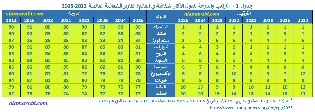 يُظهر الجدول 1 مؤشر مدركات الفساد 2026 لأفضل عشرة دول في العالم ، وتطور مكانتها كل 3 سنوات ولآخر خمسة سنوات، خلال الفترة 2012- 2026، وهي الفترة التي يُمكن خلالها مقارنة قيم المؤشر من سنة لأخرى عِبر سلسلة زمنية وفق المنهجية المعدلة لعام 2012.