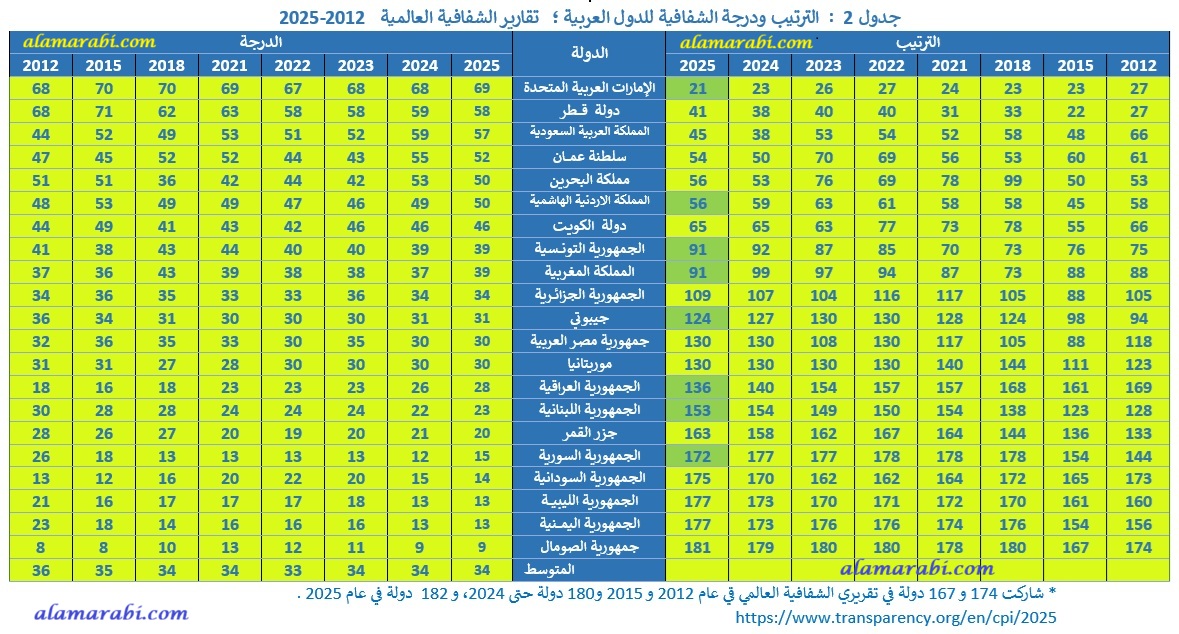 يُظهر الجدول 2 مؤشر مدركات الفساد 2025 في العالم العربي إبتداء من عام 2012. وتضم تقارير منظمة الشفافية العالمية الدول العربية، باستثناء فلسطين، بدعوى عدم توفر ثلاثة مصادر مختلفة لتقييم الفساد وفق هذه التقارير.